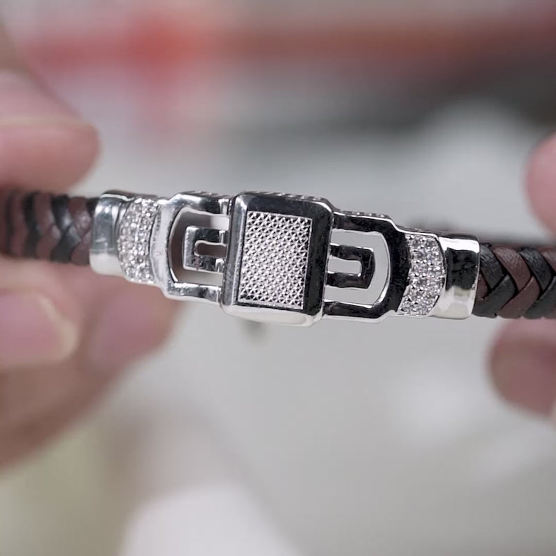 This bracelet features a finely braided dual-tone leather band in black and brown, offering both durability and a distinctive textured look. At the center, a solid 925 sterling silver plate showcases a geometric modern design, enhanced with diamond-look cubic zirconia stones set on both sides for balanced brilliance.