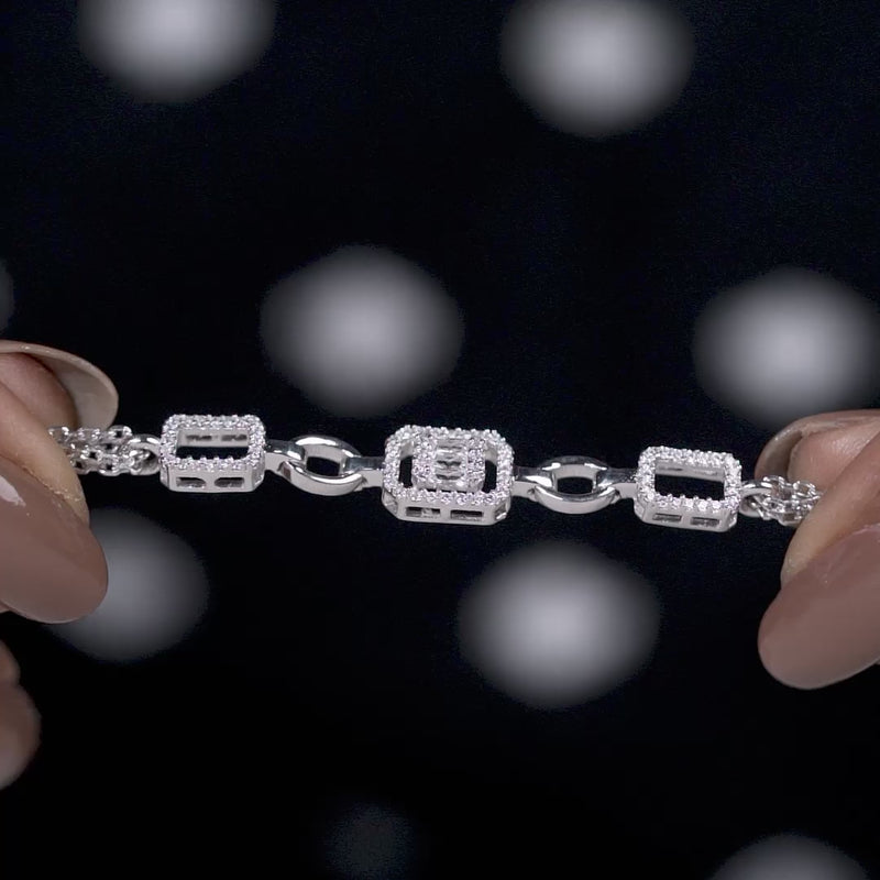 This bracelet features rectangular geometric links, highlighted with brilliant clear CZ stones set in a structured frame. The central link is accentuated with a larger baguette-style CZ stone, adding a focal point without overwhelming the design.