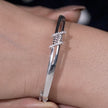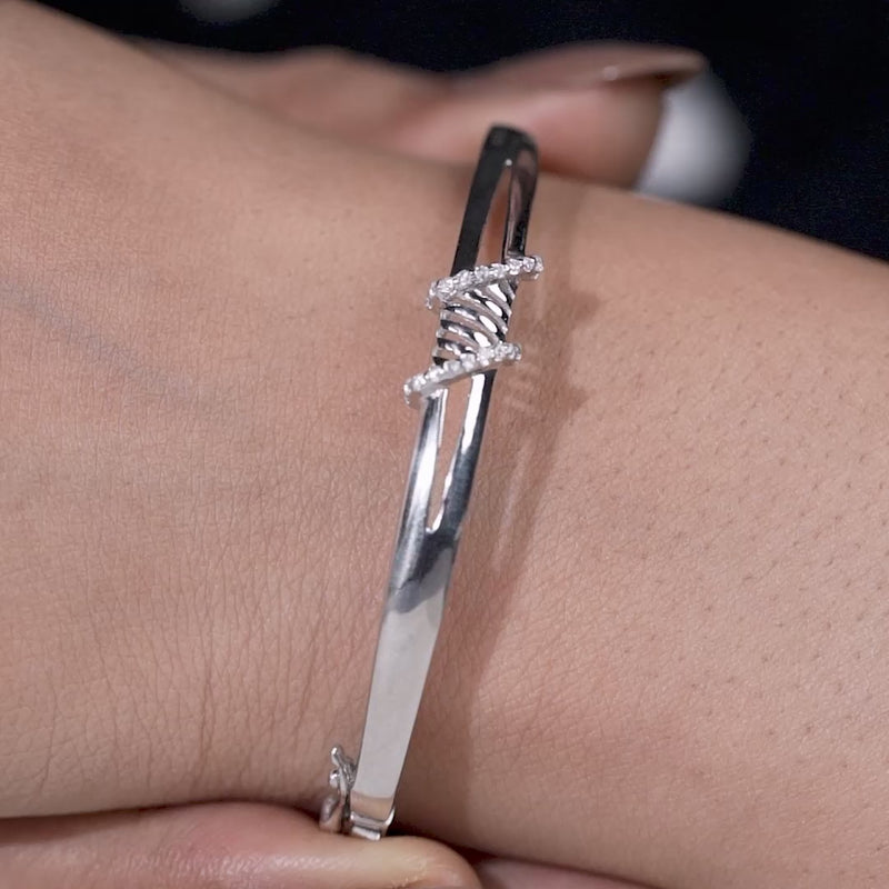 This bracelet features a sleek silver bangle accented with a delicately twisted centerpiece. One side is highlighted with shimmering Cubic Zirconia, while the other remains polished and smooth, creating a refined contrast. The minimalist silhouette makes it ideal for everyday wear while still offering a subtle sparkle.