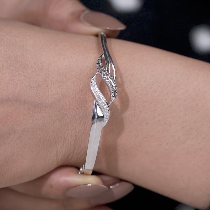 This bracelet features a sleek twisted wave motif at the center, combining a polished silver curve with a delicately pavé-set CZ wave. The contrast between high-shine silver and sparkling stones adds depth while keeping the design minimal and refined. Its slim profile makes it ideal for daily wear as well as special occasions.